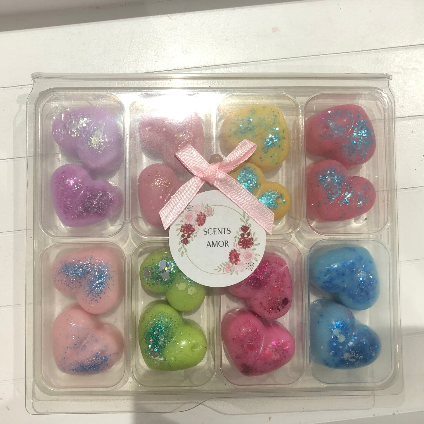 This box contains 16 little heart shaped sample melts. Includes 8 differnt scents inspired by well known bath bombs.