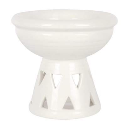 This large ceramic wax warmer features an extra deep bowl and triangle cut outs at the base. Use with oils or wax melts to gently fragrance the home while creating a calming ambience. Available in off-white or grey.