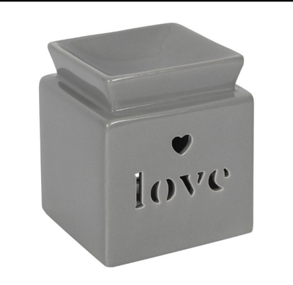 This grey ceramic burner features a cutout heart and 'love' text in a cute, contemporary design. Place fragrance oil or wax melts into the built-in dish with a standard 4 hour tealight inside to fill the home with calming fragrance.
