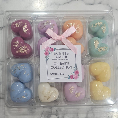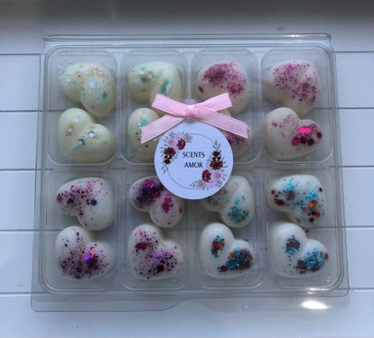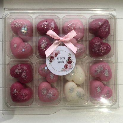This box contains 16 little heart shaped sample melts, these boxes are a great way to try a variety of scents. This box includes 8 different scents.